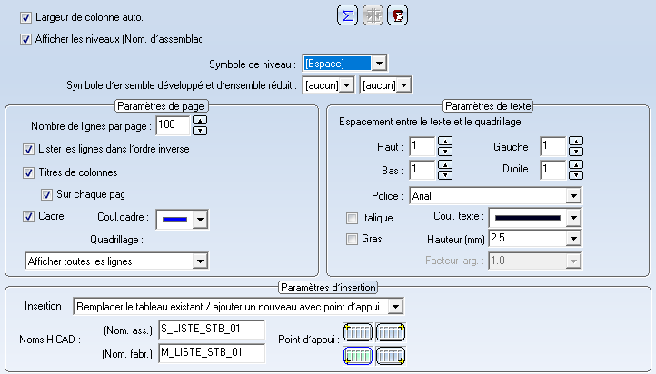 Les données affichées dans la liste peuvent être exportées sous forme de tableau ajouté à la scène HiCAD. Cet onglet vous permet de configurer les paramètres d’exportation.