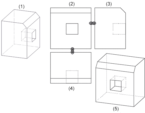 4 vues : (1) élément d'origine, (2) vue de face, (3) vue de gauche, (4) vue de dessus, (5) Axonométrie
