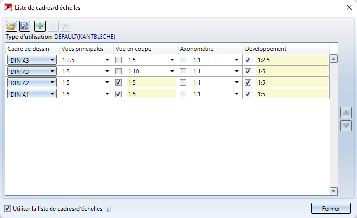 Exemple d'une liste de cadres/d'échelles pour les tôles pliées