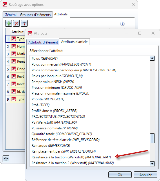 À partir du SP2, les attributs de référence des articles définis dans HELiOS peuvent également être utilisés comme critères de tris dans le repérage, par exemple la Résistance à la traction. Ceux-ci sont proposés dans la liste de sélection de l'onglet Attributs lors de l'ajout et de la modification des attributs.