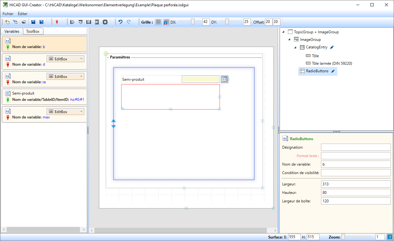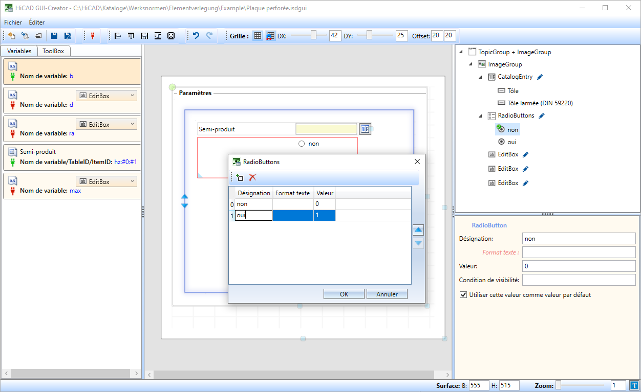 HiCAD GUI-Creator • Calepinage d'élément • Éditeur de Catalogue
