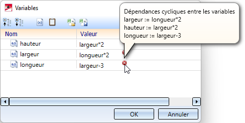 Les variables ne doivent pas se référer à elles-mêmes de façon cyclique. Si c’est le cas, un symbole d’erreur s’affichera devant les variables concernées et les valeurs des formules ne seront plus actualisées. Si vous survolez l’un de ces symboles à l’aide de votre curseur, une description de l’erreur et des variables concernées apparaîtra :