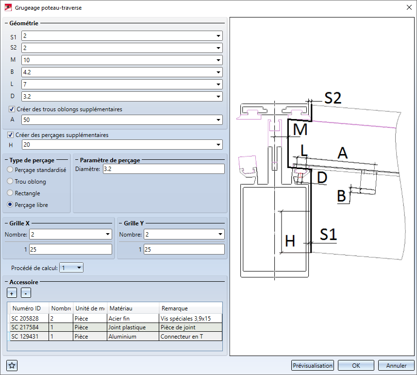Fenêtre de configuration pour un raccord d'Enveloppes de bâtiment avec perçages supplémentaires