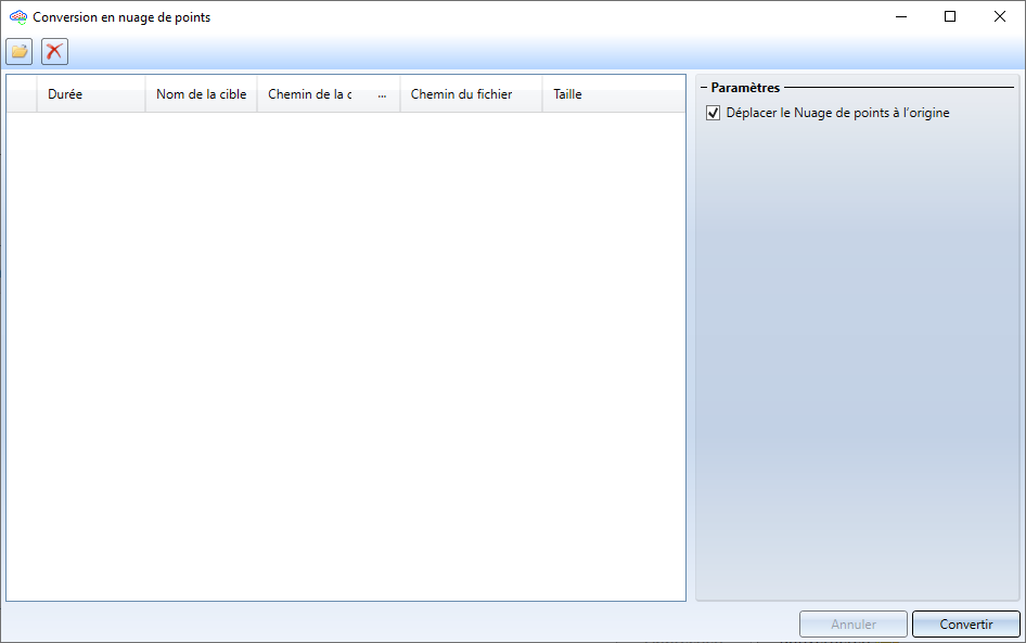 Pour sélectionner le fichier à convertir, cliquez sur le symbole Ajouter un fichier de nuage de points