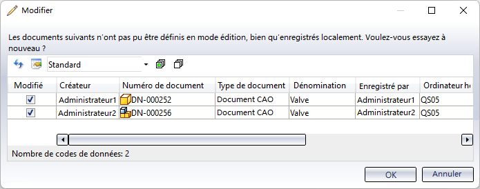 Enregistre le document et met à jour les propriétés configurées avec le serveur. Une synchronisation des attributs CAO avec HELiOS est effectuée. Tous les éléments ou structures modifiés dans la CAO sont enregistrés, y compris leurs sous-structures. Si un ensemble ne peut pas être enregistré complètement - par exemple parce que des composants modifiés (documents référencés) sont en cours de traitement par un autre utilisateur - une fenêtre de dialogue basée sur les listes des résultats HELiOS s'ouvre alors. Vous pouvez alors savoir par quel utilisateur et sur quel ordinateur hôte les documents correspondants sont bloqués.