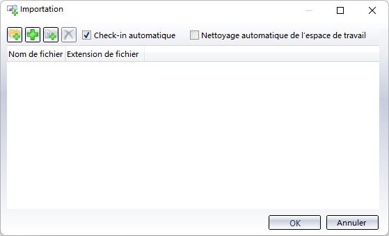 La case Nettoyage automatique de l'espace de travail vous permet de contrôler si les fichiers concernés doivent être directement supprimés de l'espace de travail après l'importation de lot. Cette option peut s'avérer utile si le chargement répété des mêmes éléments dans l'espace de travail a des répercussions sur la performance générale. Les documents qui se trouvent déjà dans l'espace de travail au moment de l'importation ne sont pas concernés par la procédure de nettoyage.
