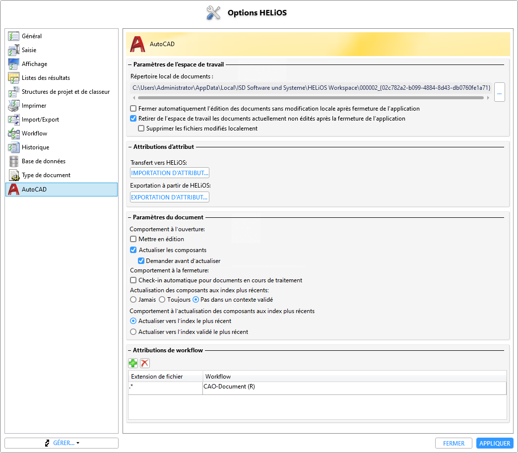 Par défaut, toutes les extensions de fichier (pour les types de fichier AutoCAD) sont attribuées au workflow de document HELiOS CAD Document (R).