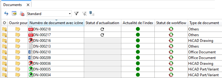 Si cette colonne a été ajoutée à la liste des résultats, elle y signale, à l'aide de l'icône , les documents qui sont actuellement actualisés par le Spooler et qui ne peuvent donc pas être affichés à jour.