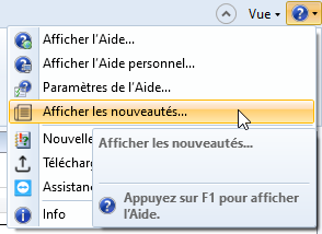 Si vous avez sélectionné l'option Ne jamais afficher, il vous sera possible de relancer ultérieurement la fenêtre des nouveautés à tout moment et ainsi de changer l'option d'affichage. Pour ce faire, allez en haut à droite dans la barre de menu HELiOS pour cliquer sur le symbole "?" puis sélectionnez la fonction Afficher les nouveautés....