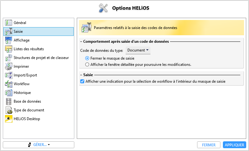 Vous pouvez paramétrer, dans l'onglet Saisie, sous Comportement après saisie d'un code de données, comment doit se comporter le programme après la création d'un document ou d'un projet.