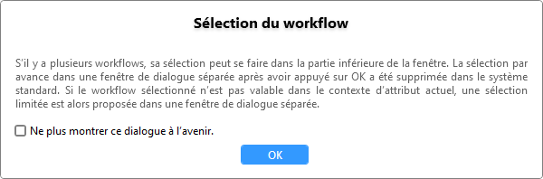 En désactivant l'option Afficher une indication pour la sélection de workflow à l’intérieur du masque de saisie sous Saisie, vous pouvez empêcher l'affichage de la fenêtre d'information suivante qui apparaît à la nouvelle saisie d'objets pour lesquels il existe plusieurs possibilités de sélection de workflow.