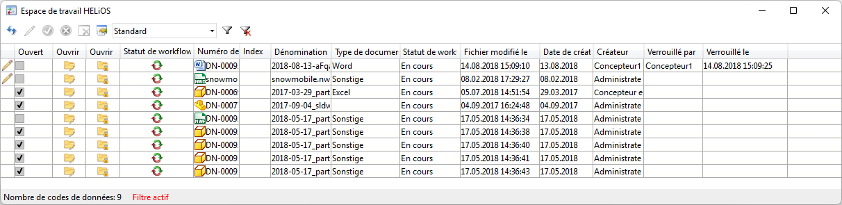 Si la case Afficher uniquement les documents ouverts (les documents chargés indirectement ne seront pas affichés) est cochée, seuls les documents qui sont ouverts dans votre application seront affichés. Les documents chargés indirectement, qui ne sont pas ouverts actuellement dans votre espace de travail CAO, seront exclus de l'aperçu de la liste de l'espace de travail HELiOS.