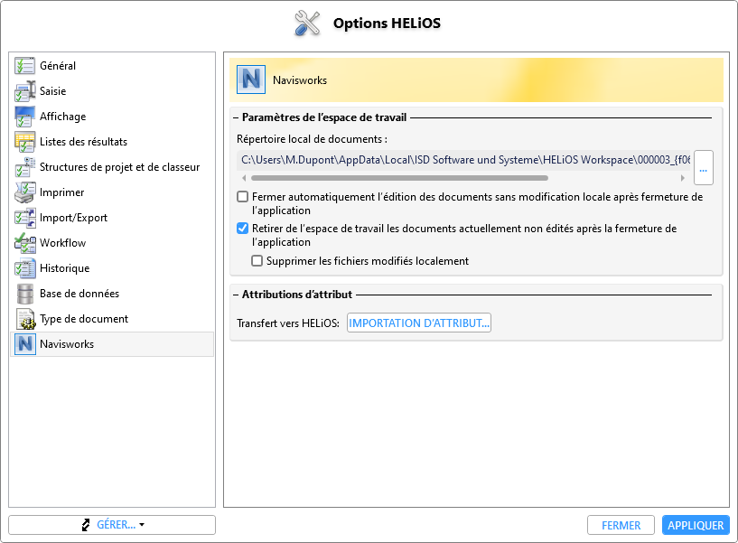Vous pouvez, dans cet encart de la fenêtre, sous Transfert vers HELiOS > Importation d'attribut..., ouvrir la fenêtre de configuration des attributs pour l'importation des données CAO vers HELiOS.