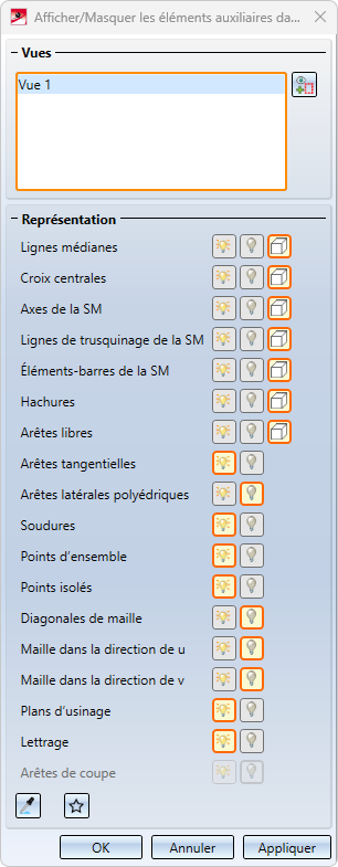 De plus, cette fonction permet d'afficher et de masquer les points d'ensemble, les points isolés, les soudures, les plans d'usinage, les lettrages et les arêtes de coupe dans certaines vues.