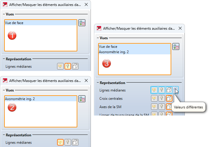 lignes médianes et système d'axes , (2) arêtes libres + lignes médianes désactivées, (3) Arêtes libres + Lignes médianes + Croix centrale désactivées