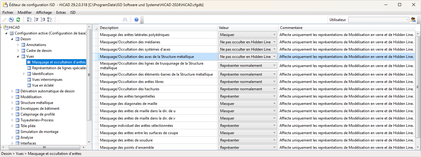 - Les paramètres prédéfinis de cette fenêtre de dialogue peuvent être modifiés dans le Gestionnaire de Configuration, et ce sous Dessin > Vues > Masquage et occultation d'arêtes.