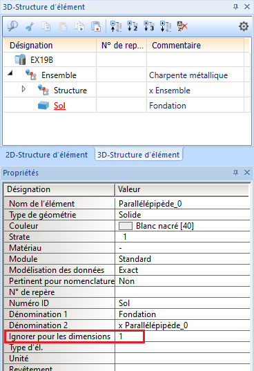 Le sol ne doit toutefois pas être pris en compte dans le calcul, il n'est qu'un élément d'aide à la construction. C'est pourquoi nous attribuons au sol l'attribut Ignorer pour les dimensions.