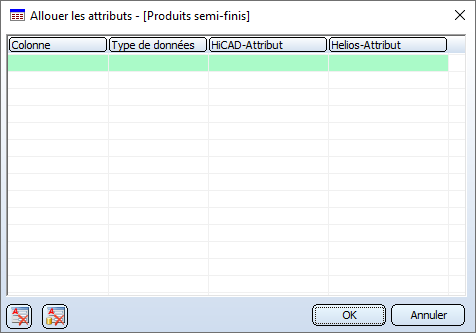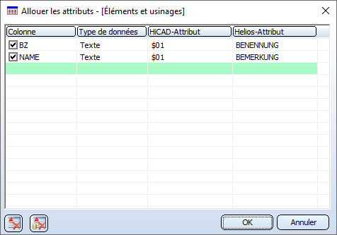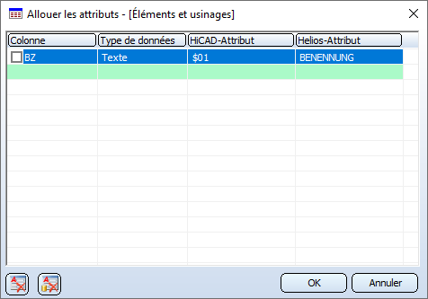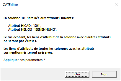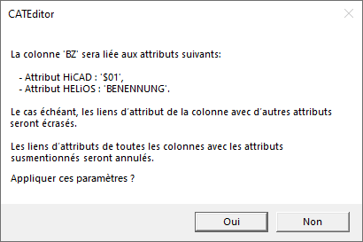 Cette fonction permet d'allouer les attributs HiCAD et HELiOS aux attributs du catalogue (colonnes du tableau) du catalogue actif (c'est-à-dire tous les tableaux de ce catalogue).