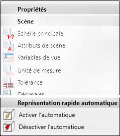 Dans le menu contextuel de la scène, vous trouvez sous Propriétés la section Représentation rapide automatique. À l'aide des fonctions de cette section, vous pouvez activer/désactiver la représentation rapide automatique. Cet automatisme place une ou plusieurs vues en mode Représentation rapide - à l'instant donné – afin d'économiser les calculs dus à la Hidden Line ou la Modélisation en verre.