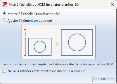 - Lorsque vous créez la première contraintes de longueur, de distance ou de rayon d'une esquisse planaire ou que vous modifiez la seule contrainte de longueur, de distance ou de rayon, la boîte de dialogue Mise à l'échelle du HCM de chaîne d'arêtes 3D. Vous pouvez définir ici si l'esquisse doit être mise à l'échelle automatiquement. Les géométries fixes sont alors déplacées.
