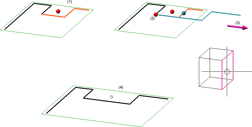 Exemple 2 - Facteur d'échelle 2, direction par sélection d'un plan : (1) Lignes-éléments sélectionnées, (2) Point fixe, (3) Direction, (4) Résultat - Déplacer les lignes, individuellement