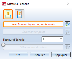 Avec Appliquer, la fenêtre de dialogue reste ouverte après la mise à l'échelle effectuée. La liste des éléments sélectionnés est alors mise à zéro, tous les autres paramètres sont conservés et ne peuvent pas être modifiés. Vous pouvez de cette façon mettre à l'échelle d'autres éléments de la même manière.