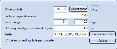 - En cochant/décochant la case Définir un seul symbole par conduite déterminez si un seul symbole d'inclinaison (case cochée) doit être généré pour chaque segment droit contigu avec inclinaison ou un symbole d'inclinaison pour chaque tuyau droit individualisé sur ce segment (case décochée). Par défaut, la case est cochée.