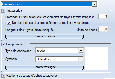 En sélectionnant l'entrée Éléments joints, il est possible de déterminer si et comment leur représentation est précise, et ce séparément pour les tuyauteries et les composants (p. ex. réservoirs et pompes). Ce faisant, il est possible de désactiver complètement la suggestion de tuyauteries/composants en décochant Tuyauteries ou Composants peut être complètement désactivée.
