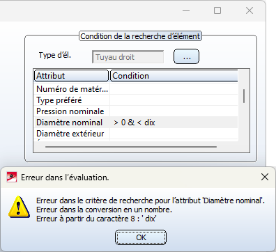 Cette requête permet de trouver tous les éléments dont l'épaisseur de paroi est de 5 et dont au moins un des diamètres nominaux a la valeur 50.