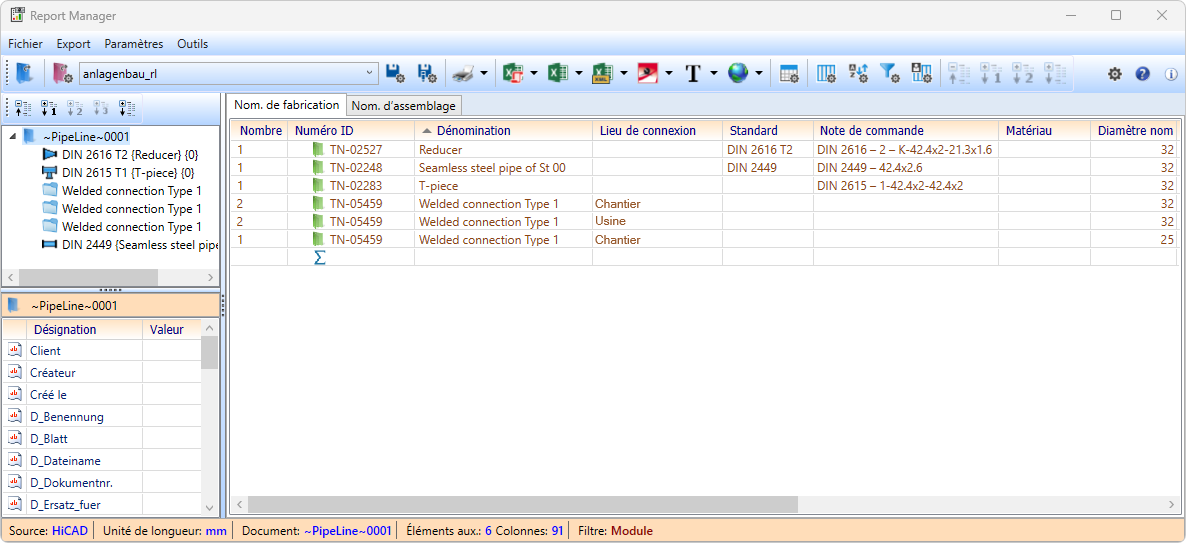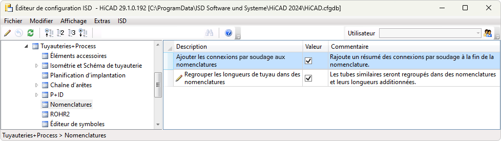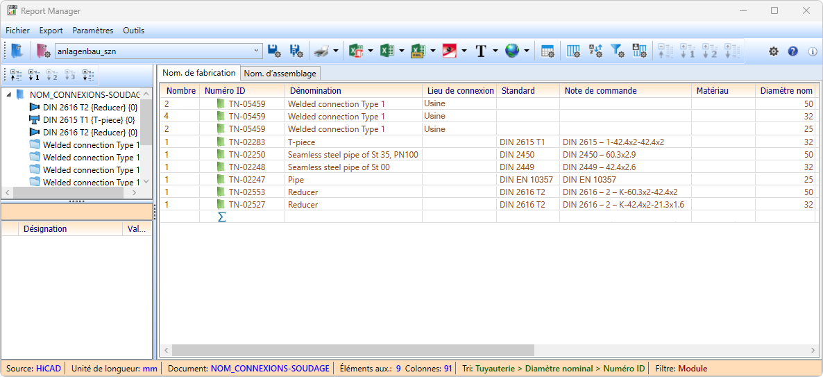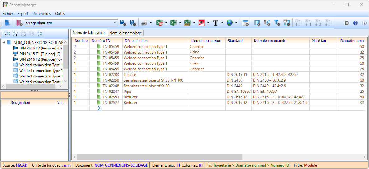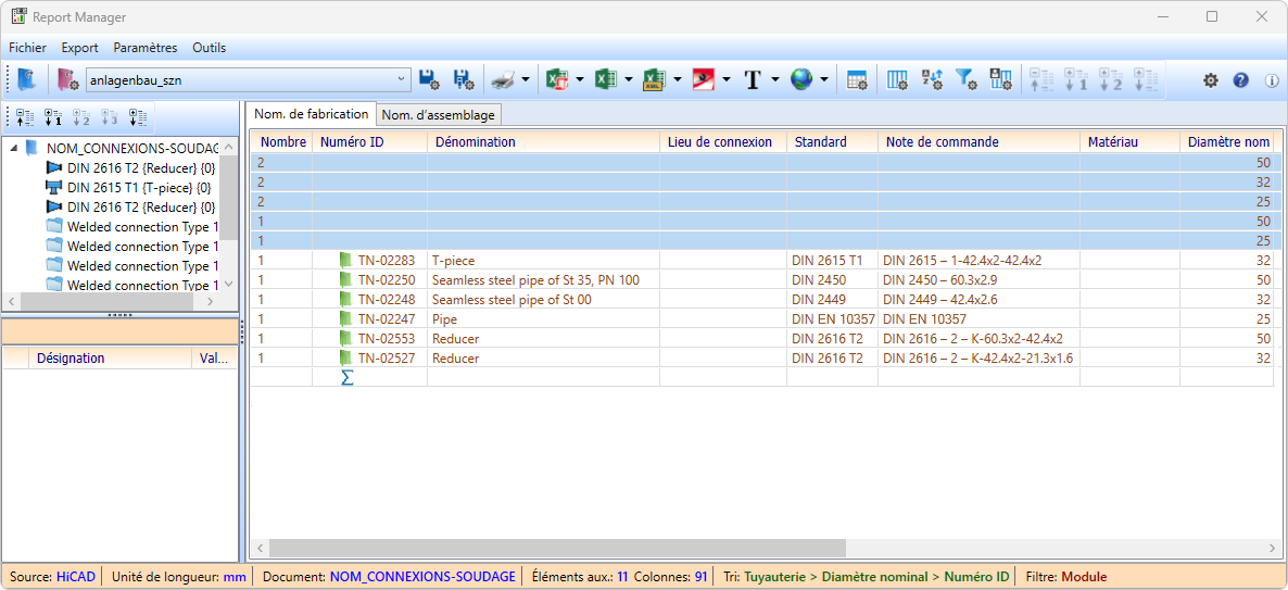 Les connexions par soudage sont regroupées dans des nomenclatures lorsque le Numéro ID, la Dénomination, le lieu de connexion et le Diamètre nominal sont identiques. Le Numéro ID et le Diamètre nominal proviennent de l'article de la connexion, de sorte que les connexions par soudage ayant le même Numéro ID ont toujours la même Dénomination. L'article d'une connexion est défini dans les Paramètres de l'isométrie/du schéma de tuyauterie.