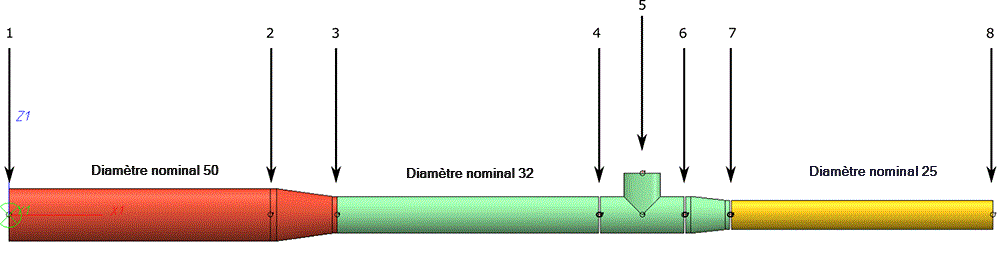 La scène représentée se compose de trois tuyauteries de diamètres nominaux différents, reliées entre elles par des réducteurs.