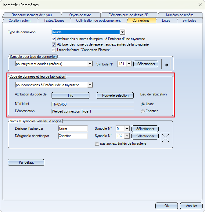 En plus des Paramètres pour Isométrie/Schéma de tuyauterie, définis de façon globale, il est possible de paramétrer individuellement les données d'une connexion à l'aide de la fonction Afficher/Modifier les infos de connexion