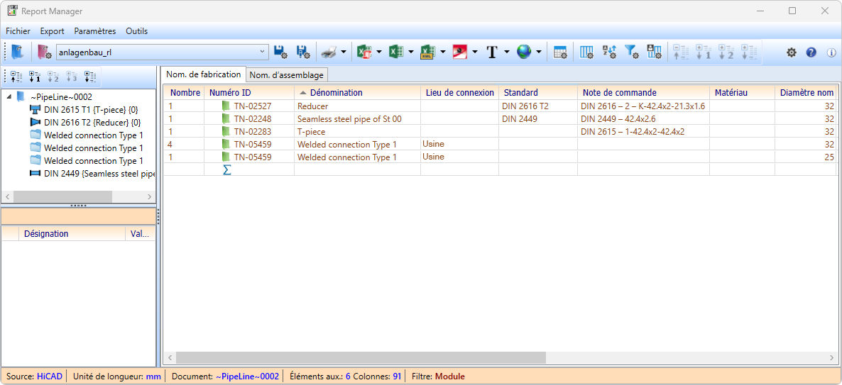 Les fonctions de la nomenclature de HiCAD vous permettent de créer des nomenclatures pour une tuyauterie individuellement ou pour l'ensemble de la scène. Dans l'exemple, nous allons d'abord utiliser la fonction
