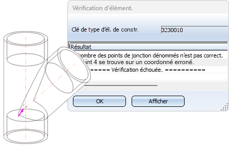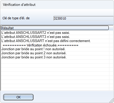 Les résultats de la vérification sont consignés dans une fenêtre de dialogue. Si vous avez par exemple sélectionné Dérivation comme type d'élément, le système vérifie maintenant si la géométrie remplit les conditions nécessaires pour le type d'élément Dérivation. Le résultat de la vérification est ensuite affiché dans une fenêtre de dialogue.
