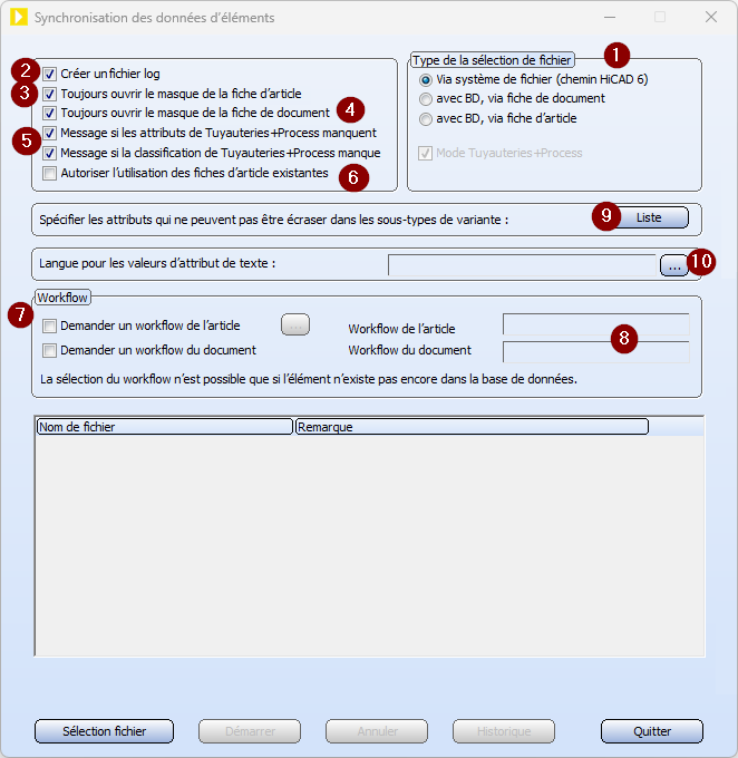 Après avoir cliqué sur le bouton Sélection fichier sélectionnez le ou les fichiers pour lesquels la synchronisation des données d'éléments doit être effectuée. Le type de sélection de fichiers est déterminé par le paramétrage décrit ci-dessus (1). Les fichiers sélectionnés sont listés dans un tableau.