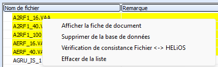 Les lignes des fichiers pour lesquels une fiche de document existe déjà dans la base de données sont automatiquement surlignées en jaune. Si vous sélectionnez une ligne surlignée en jaune par un clic droit, un menu contextuel s'affiche et qui vous permet :