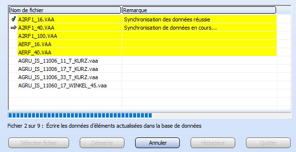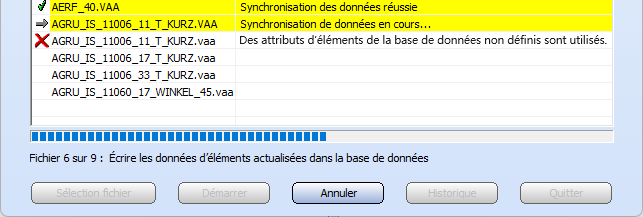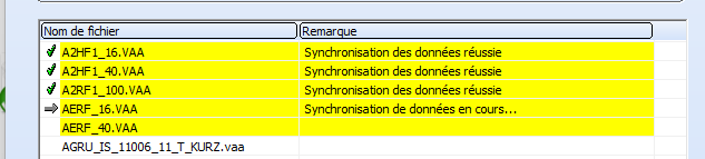 Dans la liste, l'icône dans la première colonne et le texte dans la colonne Remarque indiquent si la synchronisation des données d'éléments a été effectuée avec succès pour le fichier concerné ou si une erreur est survenue.