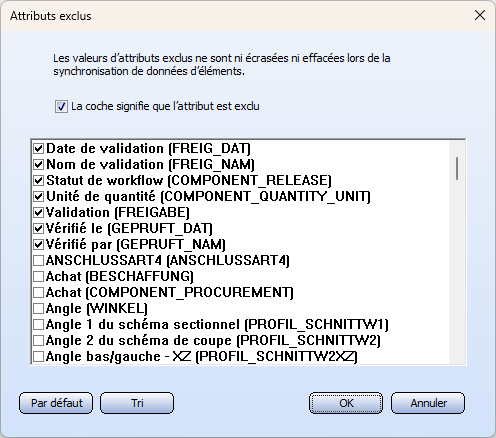 Lorsque vous ouvrez la fenêtre de dialogue, la liste est toujours triée de manière à ce que les attributs sélectionnés soient classés par ordre alphabétique au début de la liste. Tous les autres attributs suivent ensuite, également par ordre alphabétique. Vous pouvez toujours rétablir ce tri en cliquant sur Tri, par exemple après avoir sélectionné d'autres attributs.