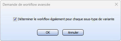 Si la case Déterminer le workflow également pour chaque sous-type de variante est cochée, le masque d'élément s'ouvre alors pour une variante non seulement pour le type général, mais aussi pour chaque sous-type individuel, et le système vous demande d'indiquer le workflow, dans la mesure où il existe plusieurs workflows d'éléments.