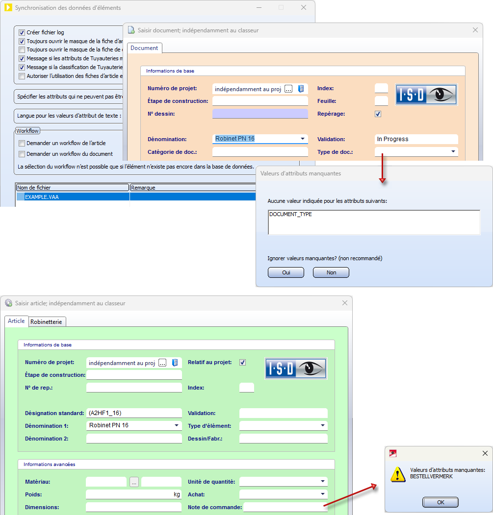 Si des attributs obligatoires manquent dans la fiche d'article ou de document lors de la synchronisation des données, par exemple le type de document (DOCUMENT_TYPE) ou la note de commande (BESTELLVERMERK), HiCAD affiche une remarque correspondante. Vous avez alors la possibilité de saisir les attributs manquants. Vous pouvez aussi créer une fiche de document malgré l'absence d'attributs, mais cela n'est pas recommandé. En revanche, cela n'est pas possible en l'absence d'attributs d'articles.