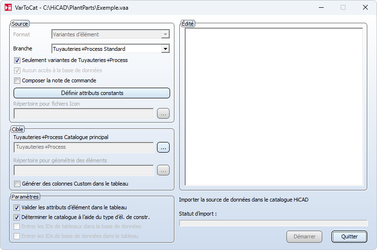 Lorsque vous quittez l'Éditeur de variantes, le programme VarToCat s'exécute automatiquement. Il vous permet de transférer les données de l'élément d'un fichier VAA vers le catalogue HiCAD. Le chemin complet du fichier VAA nouvellement dérivé est affiché comme titre de la fenêtre.