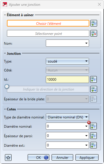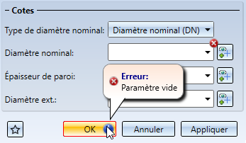 Il est impératif d'indiquer le diamètre nominal. Sinon la jonction de composants ne sera pas générée ! |