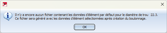Si vous avez à nouveau besoin d'un boulon pour le même diamètre de trou, le dernier ensemble créé sera proposé à la sélection lorsque vous ouvrirez à nouveau la fenêtre.