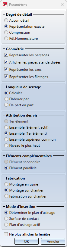Tout d'abord, la fenêtre des paramètres généraux pour les assemblages boulonnés s'affiche (si elle n'a pas été désactivée à l'aide de la case Ne plus afficher la fenêtre). Ici, ce sont surtout les options Degré de détail et Géométrie qui sont intéressantes. Dans la zone Longueur de serrage, vous devez toujours choisir l'option Calculer. Le mode d'insertion spécifié n'est pas pertinent ici.