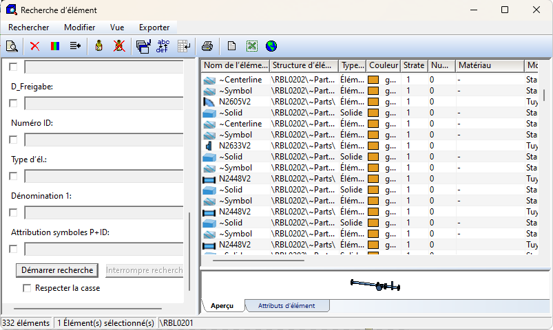 Le résultat de la recherche s'affiche à droite dans la fenêtre de dialogue. Dans la colonne Attribution symbole P+ID, l'entrée Oui, signifie qu'un symbole P+ID est attribué à l'élément. Si l'entrée est non, aucun symbole P+ID n'est attribué. Une entrée vide signifie que l'élément n'a pas été pris en compte lors de l'examen.