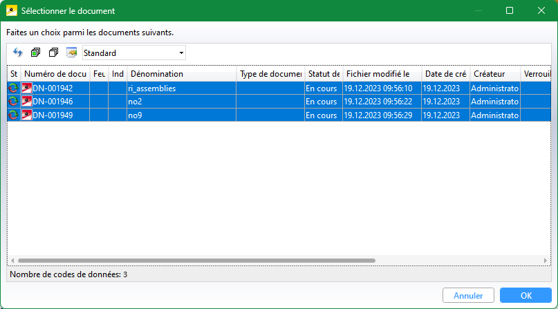Si l'ensemble est couplé à plusieurs Schémas P+ID, une liste de sélection s'affiche avec les fiches de document correspondantes, à partir desquelles vous pouvez alors sélectionner le Schéma P+ID de votre choix.