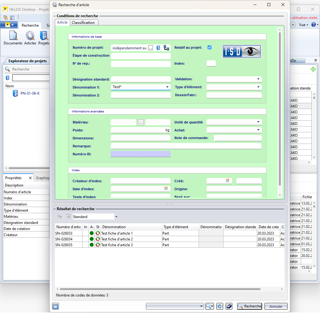 Démarrez tout d'abord HELiOS Desktop et créez une liste des résultats via la recherche d'articles en définissant des conditions de recherche appropriées. Cette liste devra contenir les fiches d'article que vous souhaitez utiliser pour la variante d'élément. Laissez cette fenêtre ouverte, elle sera nécessaire plus tard.