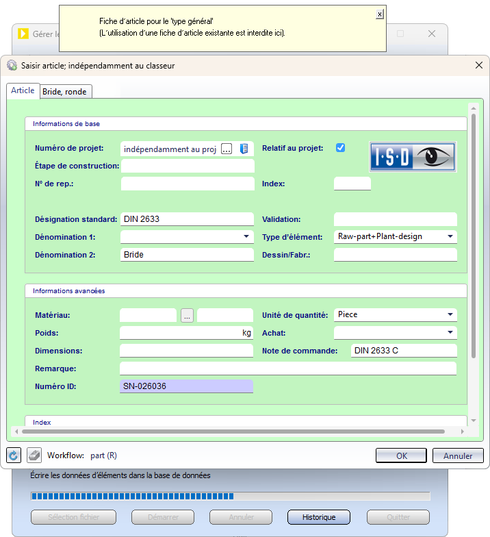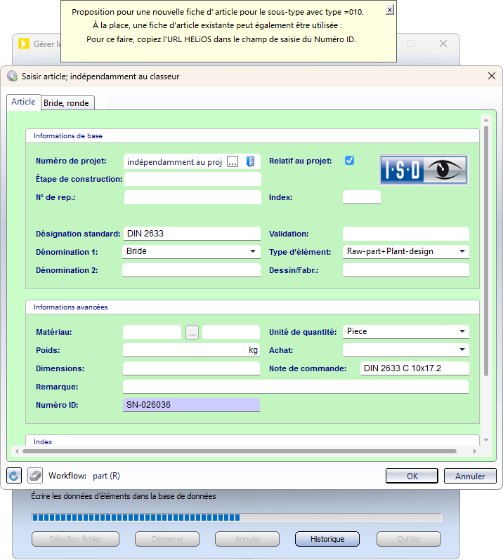 Les attributs importants pour la fonctionnalité de Tuyauterie+Process HiCAD (comme le diamètre nominal, l'épaisseur de paroi, le diamètre extérieur, le type de raccordement, etc.) doivent impérativement être transférés sur la fiche d'article transférée, sinon des problèmes pourraient survenir lors de l'insertion d'élément.