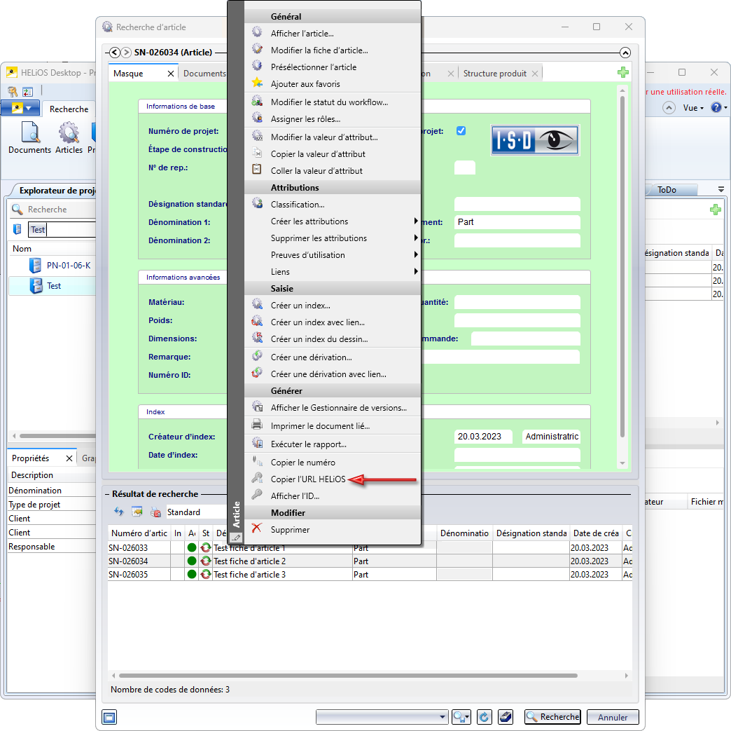 Si vous ne voulez pas avoir une nouvelle fiche d'article pour ce sous-type, mais transférer une fiche d'article existante, allez maintenant dans la fenêtre de recherche d'article dans HELiOS Desktop, et, avec un clic droit sur la fiche d'article souhaitée, choisissez l'option Copier l'URL HELiOS.