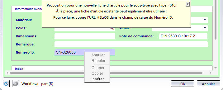 Avec un clic droit, vous allez maintenant dans le champ de saisie du numéro d'article dans la fenêtre de saisie de l'article de DbPlantDataImport. Dans le menu contextuel, sélectionnez l'option Insérer.
